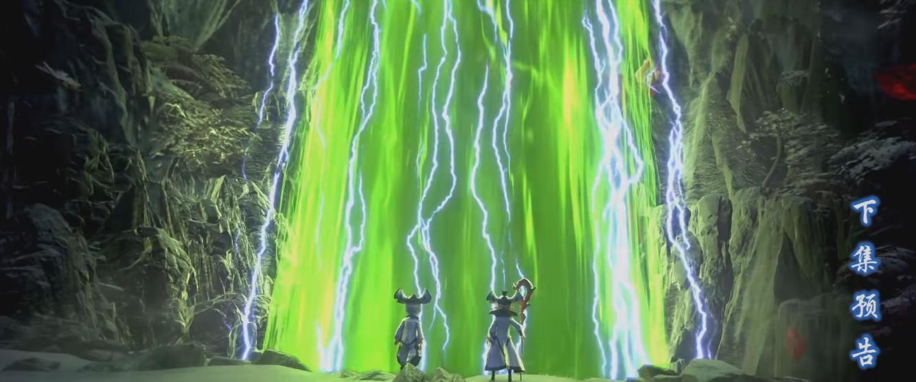 雖然沒能看到蕭炎吸收金色能量,淬鍊分身靈魂的畫面,但是預告中有一道綠色的異火光柱,從血潭升起,直逼蒼穹,而金石和金谷就在巨石旁等待。這明顯就是蕭炎要出關了,這也意味着蕭炎霸氣突破了鬥宗,整個人都要不一樣了。