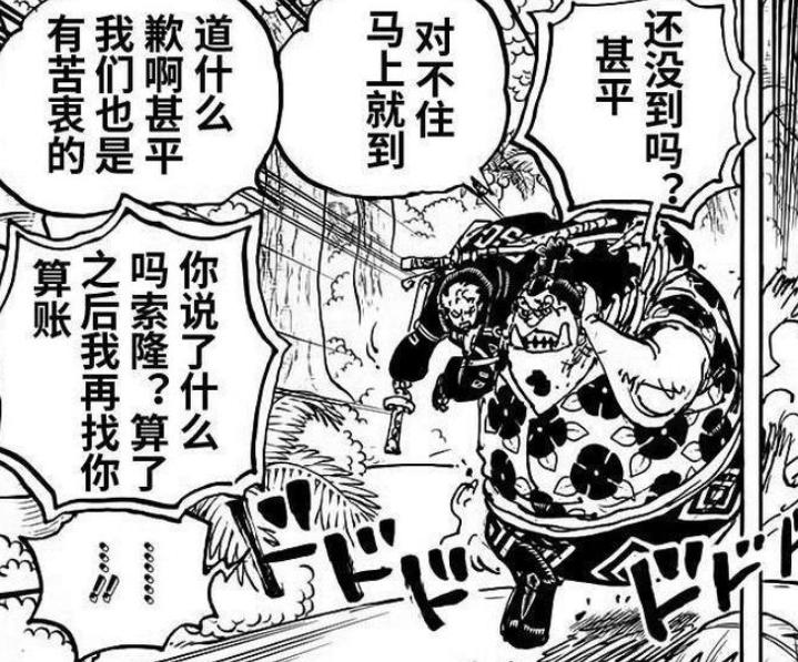 根據娜美與甚平的通話,我們可以得知,草帽一夥要在巨兵海賊團的船隻那裏碰頭,這也意味着索隆和甚平正在前往巨兵海賊團船隻的路上。別忘了,那裏正發生大戰,金星納斯壽郎聖與波妮以及山治開戰呢,而且金星納斯壽郎聖完全碾壓了波妮他們,索隆和甚平抵達之後,正好能夠與金星納斯壽郎聖過過手。尤其是索隆和金星,能夠看一場刀劍盛宴。