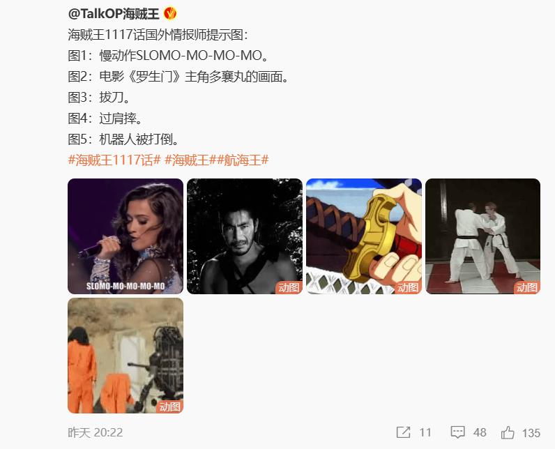 對於情報師公佈的前兩個謎語圖,其實海迷們有一些迷茫,畢竟第一張謎語圖是“慢動作”,和第二張謎語圖“電影羅生門主角多襄丸”方向實在是太廣泛了,一點都不好判斷。但是第三張謎語圖“拔刀”和第四張謎語圖“過肩摔”,就比較直白了,簡直是就是一目瞭然。