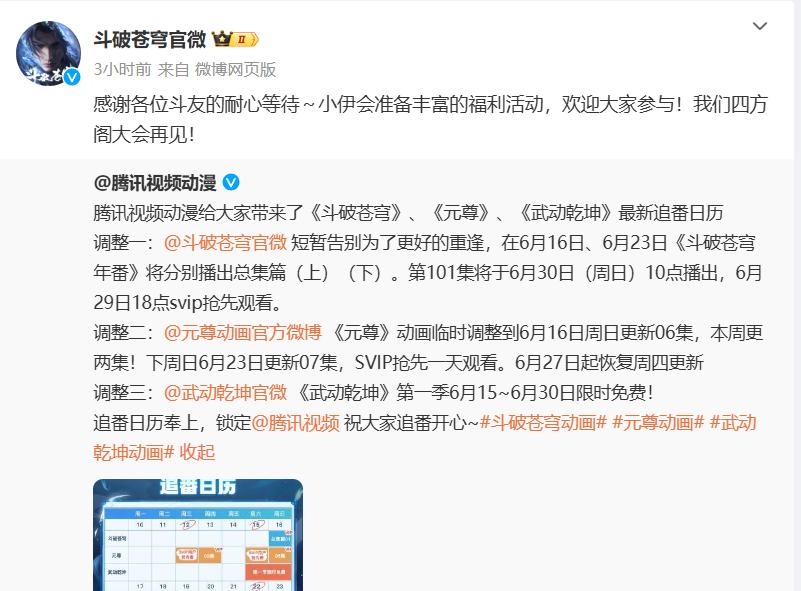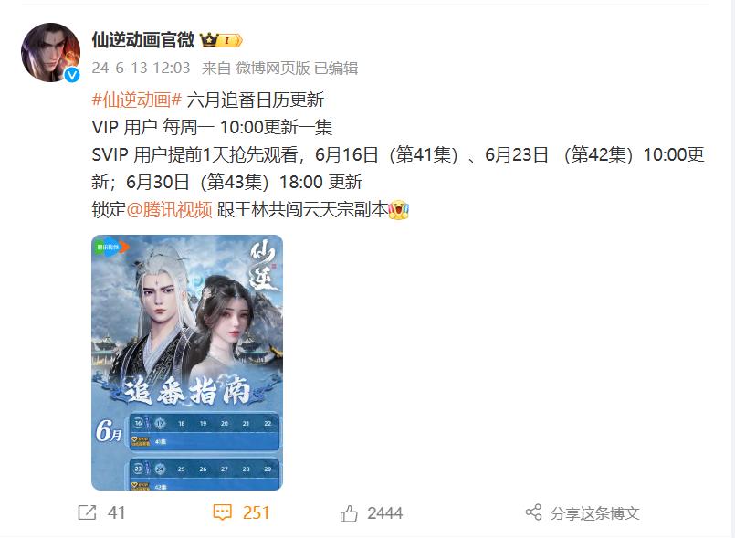 或許是播出平臺看到了粉絲們的吐槽,也意識到元尊動畫的影響力不如鬥破蒼穹年番動畫,於是又緊急調整了仙逆動畫來助力。從仙逆動畫官微發佈的動態來看,VIP會員依舊是週一檔十點鐘觀看仙逆動畫,而SVIP則可以在週日檔的十點鐘提前觀看仙逆動畫。