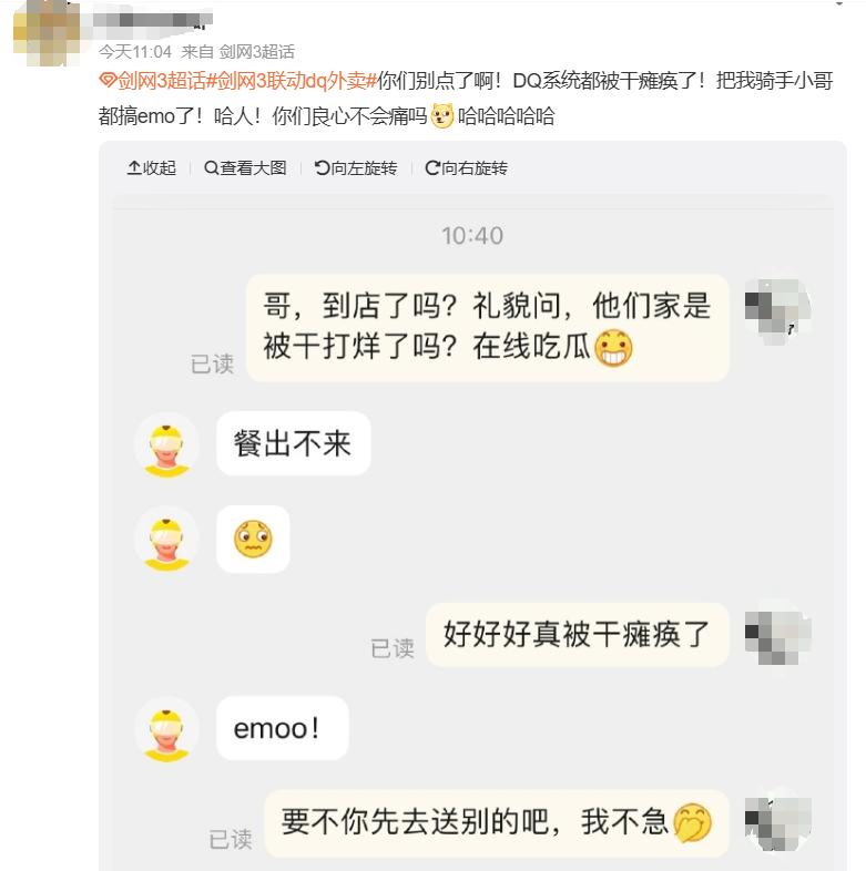 而說到EMO,外賣小哥們表示自己也有很多話要說。看到自己的訂單遲遲沒有出餐,刷帖又看到線下店鋪各種“人潮湧動”,不少玩家直接連線身處第一線的騎手,開啓“在線喫瓜”模式。“餐出不出來”“emoo!”光從外賣小哥的回答也能感受到他內心深處的“絕望”。