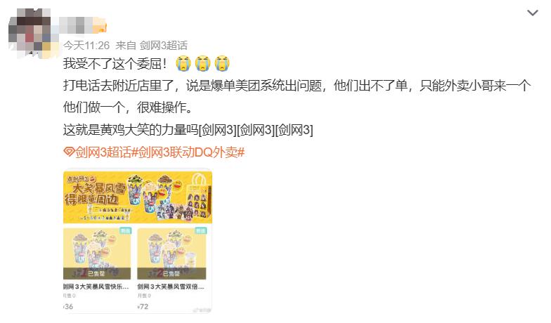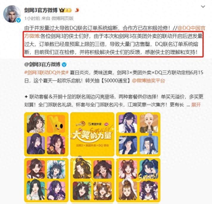6月15日,劍網3與DQ的聯動活動正式開啓,除了各地線下店面一片“人山人海”的熱鬧景象,線上平臺更是火爆的超乎所有人的預料,甚至美團平臺的DQ點單系統都直接“熔斷”了!