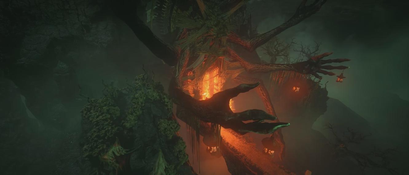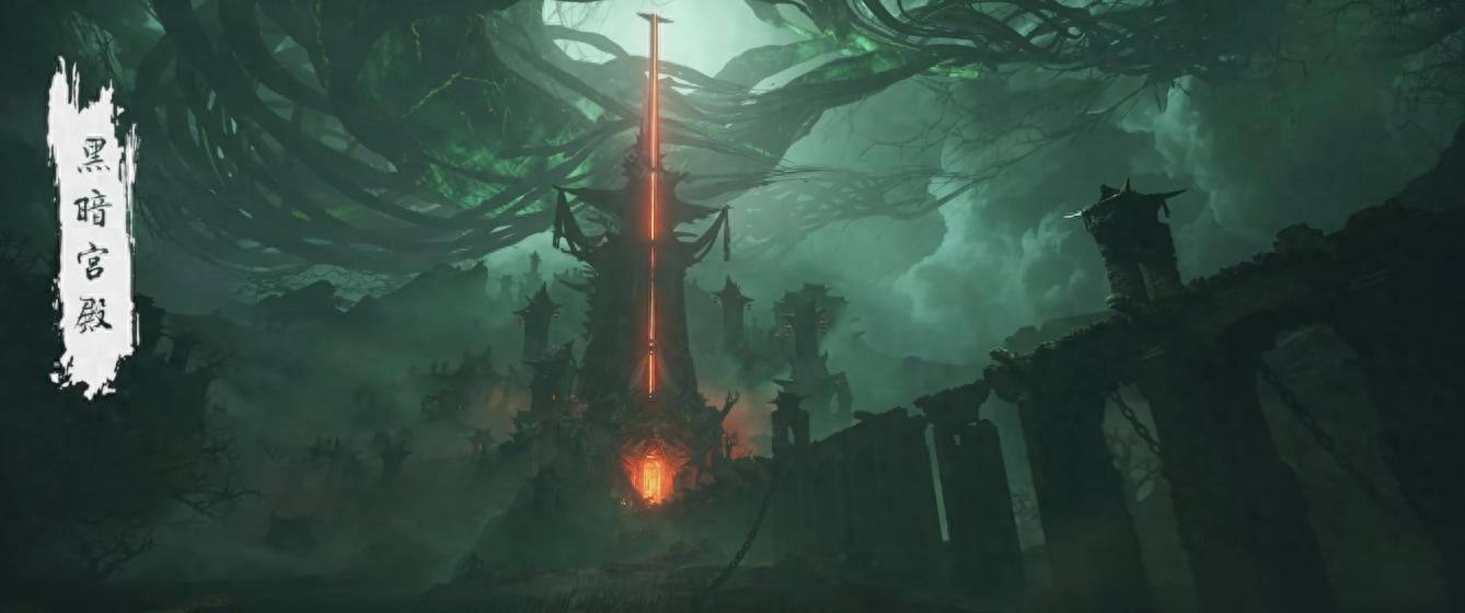 而且黑暗宮殿的外觀,感覺像是一個巨大的石碑,周圍更是佈滿了大大小小的石碑,完全像是進入了一個墳場。而且在入口處,伸出了好幾條有藤蔓樹枝的巨大手掌,有點羣魔亂舞的味道。整個空間都瀰漫着綠色濃郁的霧氣,相當的陰森,處處透露着邪惡的氣息。同時黑暗宮殿裏面,還有一個溶洞,溶洞中央有個類似祭壇的圓壇,十分詭異。