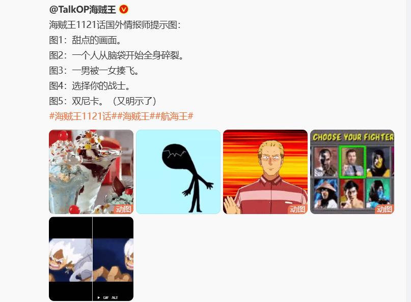 目前情報師一共發佈了五張謎語圖,第一個謎語圖是甜點的畫面,有的人認爲是四皇大媽迴歸,也有人說是扉頁故事,這個不好評價。不過第二個謎語圖一個人從腦袋開始全身破裂,這個就比較容易了,應該大概率指得就是古代機器人了。畢竟在上一話中,古代機器人就準備放大招,要打五老星了。