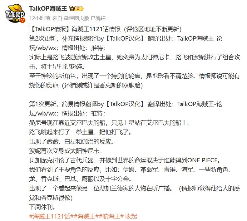 海賊王漫畫第1121話情報已經正式更新了,只不過情報師太小氣了,連續公佈了兩撥情報,信息量都很少,但是內容倒是挺炸裂的。不但有波妮和路飛又開啓了雙尼卡形態,吊打土星薩坦聖,而且伊姆貌似也盯上了大寶藏。或許拉夫德魯將成爲決戰地,同時紅髮香克斯的同胞兄弟閃亮登場了,下面就讓我們一起來深入看看吧。