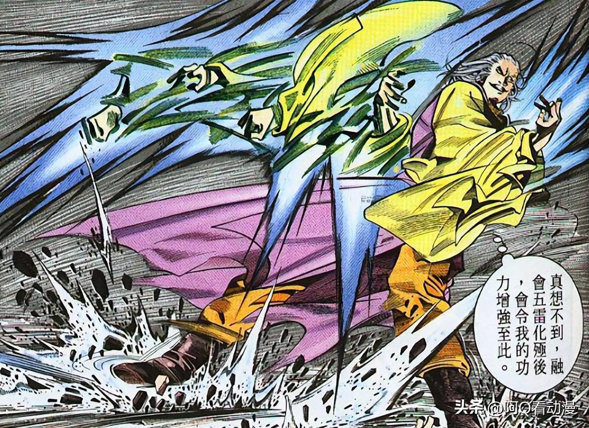 漫畫後期,怒風雷將五雷化極手的特殊功力,傳給了帝釋天,雖然是陷阱,但也實打實讓帝釋天的功力翻了數倍,漫畫裏帝釋天親口說的,五雷化極手的功力,不僅讓他的內力變得更加霸道剛猛,還提升了數倍,兩千年翻數倍,鬼知道這個狀態下的帝釋天有多猛,只可惜帝釋天還沒來得及展露實力(簡單出了兩招,已經碾壓了單龍元步驚雲),就被五雷化極手反噬,失去了所有的功力。