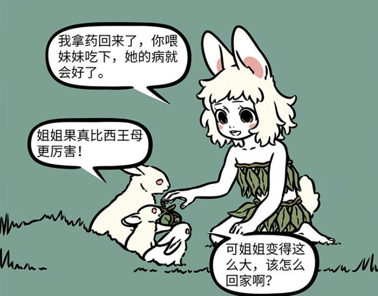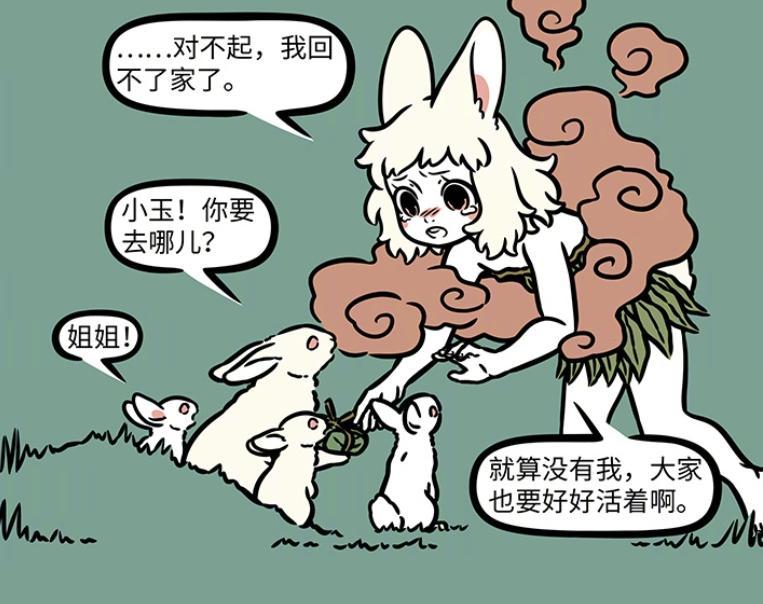 而小玉妹妹直呼自己的姐姐,比西王母還要厲害,但是也心生疑惑,姐姐變得這麼大,該怎麼回家呢?畢竟兔子的家都比較小,根本容不下小玉的身體。隨後小玉便傷心地說道,對不起了,自己恐怕回不了家了。小玉話音剛落,自己的身體便被雲朵包裹起來,隨後便慢慢的飄向空中。