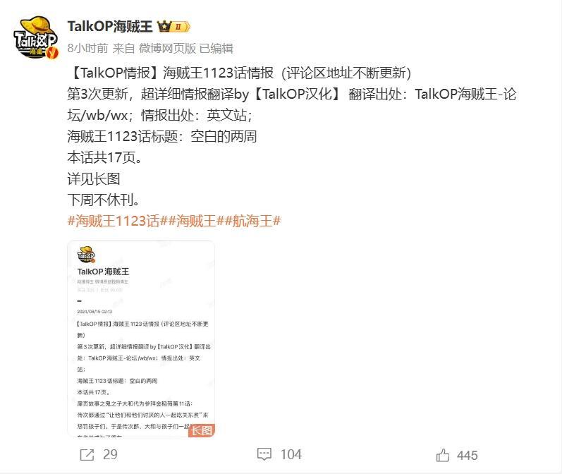 海賊王漫畫第1123話的文字情報已經全部公佈了,路飛他們成功逃離了蛋頭島,正在前往艾爾巴夫的途中。本話屬於過渡性的戲份,但是同樣也帶來了炸裂的信息,一個是空白兩週的祕密被揭開了,一個是貝加龐克再添壯舉,研發出了拯救世界的科技,下面就讓我們一起來深入看看吧。