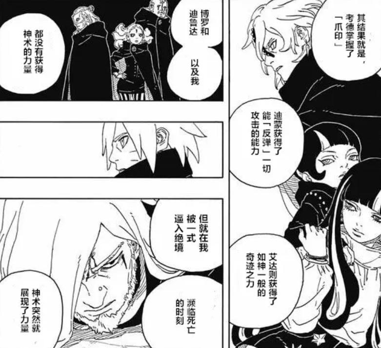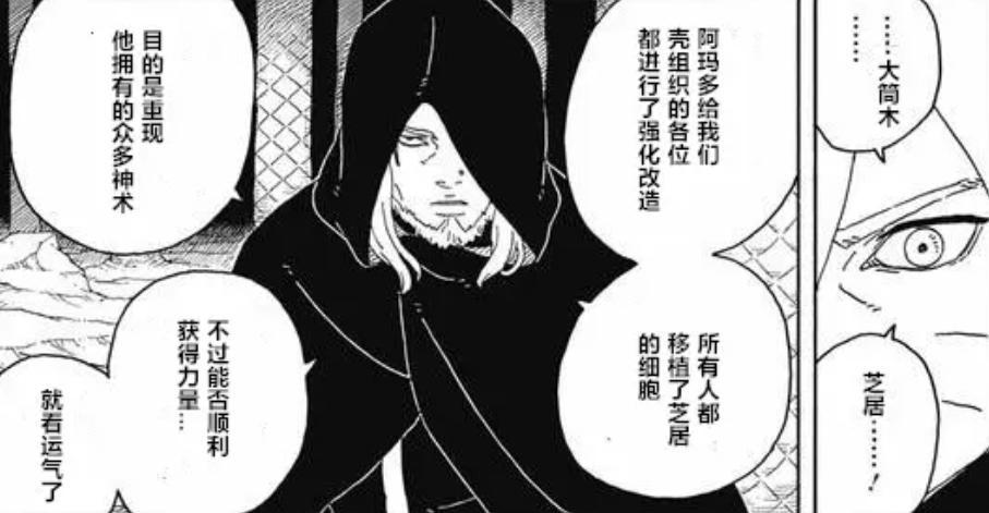 在果心居士與漩渦博人的回憶中,果心居士爲了取得漩渦博人的信任,可謂是爆料了不少的重要信息。不單單揭曉了自己預知未來的能力,而且還告訴了漩渦博人一個炸裂的情報,那就是殼組織的所有改造人,基本上都被阿瑪多移植了大筒木之神,也就是大筒木芝居的細胞。