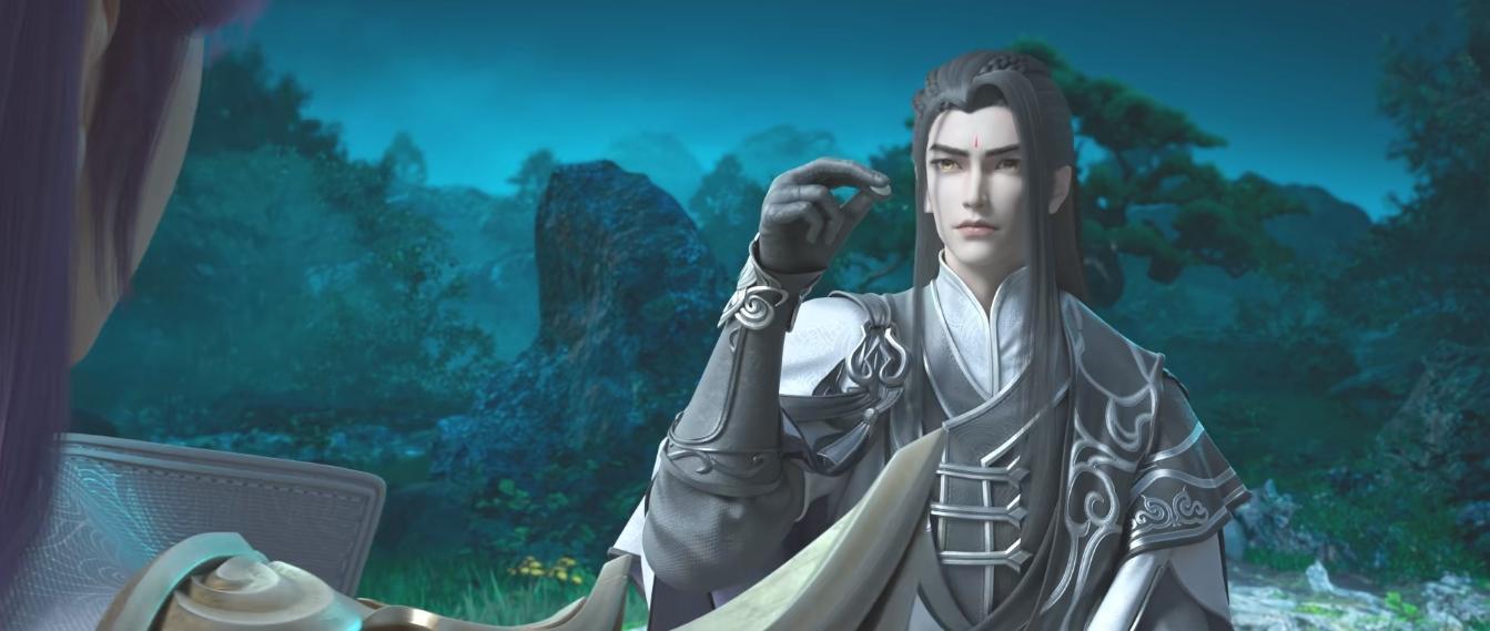 從先行預告中能夠看到,有三位全新的角色驚豔亮相,而且個個都是帥哥級的。其中有兩個帥哥,身在一處幽靜的神祕之地,兩個人正在下圍棋,打發時間。那個留着一頭紫色中分長髮,身穿紫色銀色相見的長袍,佩戴金色肩甲的帥哥,正是冰雪禁地中的古代怪胎鈞道道人,五官還是蠻清秀的。