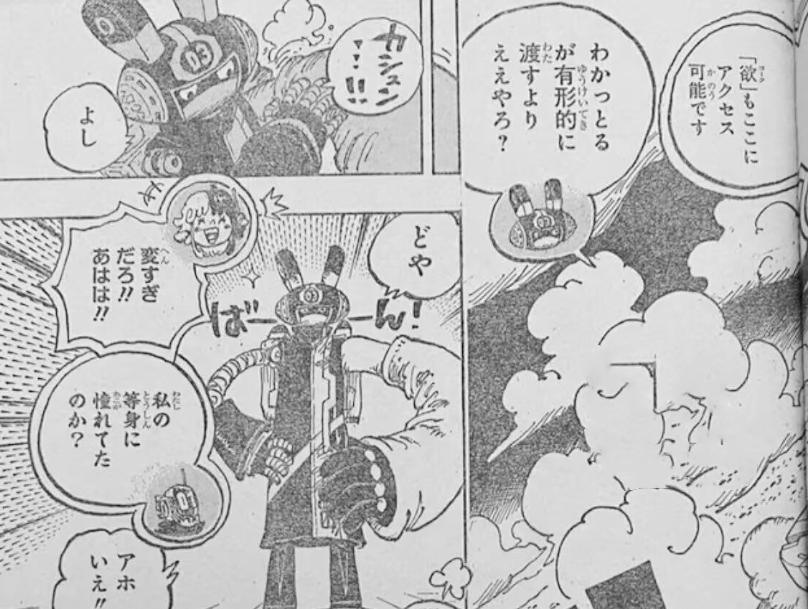 雖然釋迦和愛迪生以及畢達哥拉斯阿特拉斯的身體被毀掉了,但是他們的意識保留下來了,還利用蛋頭島穹頂內部走廊裏存放的許多貝加龐克克隆體的替換零件,重新造了一個新的身體。新的貝加龐克是愛迪生的腦袋,釋迦的軀幹和腿,阿特拉斯的左臂,以及畢達哥拉斯的右臂組建而成的,他們四個人在同一具身體中講話。