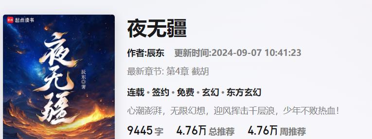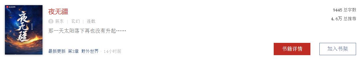 2024年9月6日,晚年不詳的辰天帝再次重活一世,在上一部小說《深空彼岸》完結長達一年後,終於發佈了新書《夜無疆》。