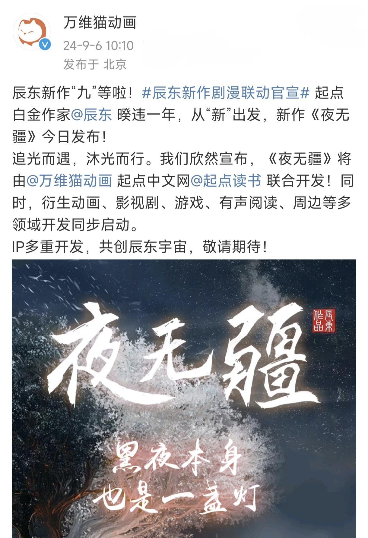 在9月6日上午十點,萬維貓動畫官方發帖,表示將會和起點聯合開發《夜無疆》IP,同步對衍生動畫、影視劇、遊戲、有聲閱讀、周邊等多領域進行開發!