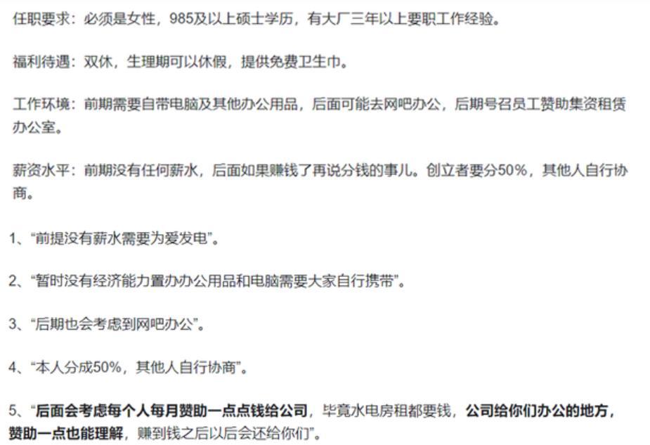 在這些門檻要求之外,更令人大跌眼鏡的是該職位不僅沒有報酬,還需候選人主動“捐款捐物”,理由竟是公司提供了辦公場所,且如果將來公司盈利,老闆會佔據一半股份,其餘部分則由“姐妹們”自己協商分配。此言一出,不少網友戲稱這簡直就是“現代農奴制”,更有甚者認爲這是對職場女性權益的赤裸裸壓榨。