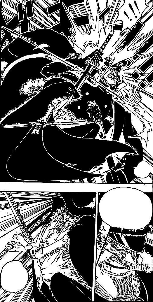 鷹眼的黑刀夜在希留的挑戰下,讓其受傷頗重,連手中的名刀都受損不已。鷹眼的劍術出神入化,輕描淡寫之間便能釋放出驚人的破壞力。
