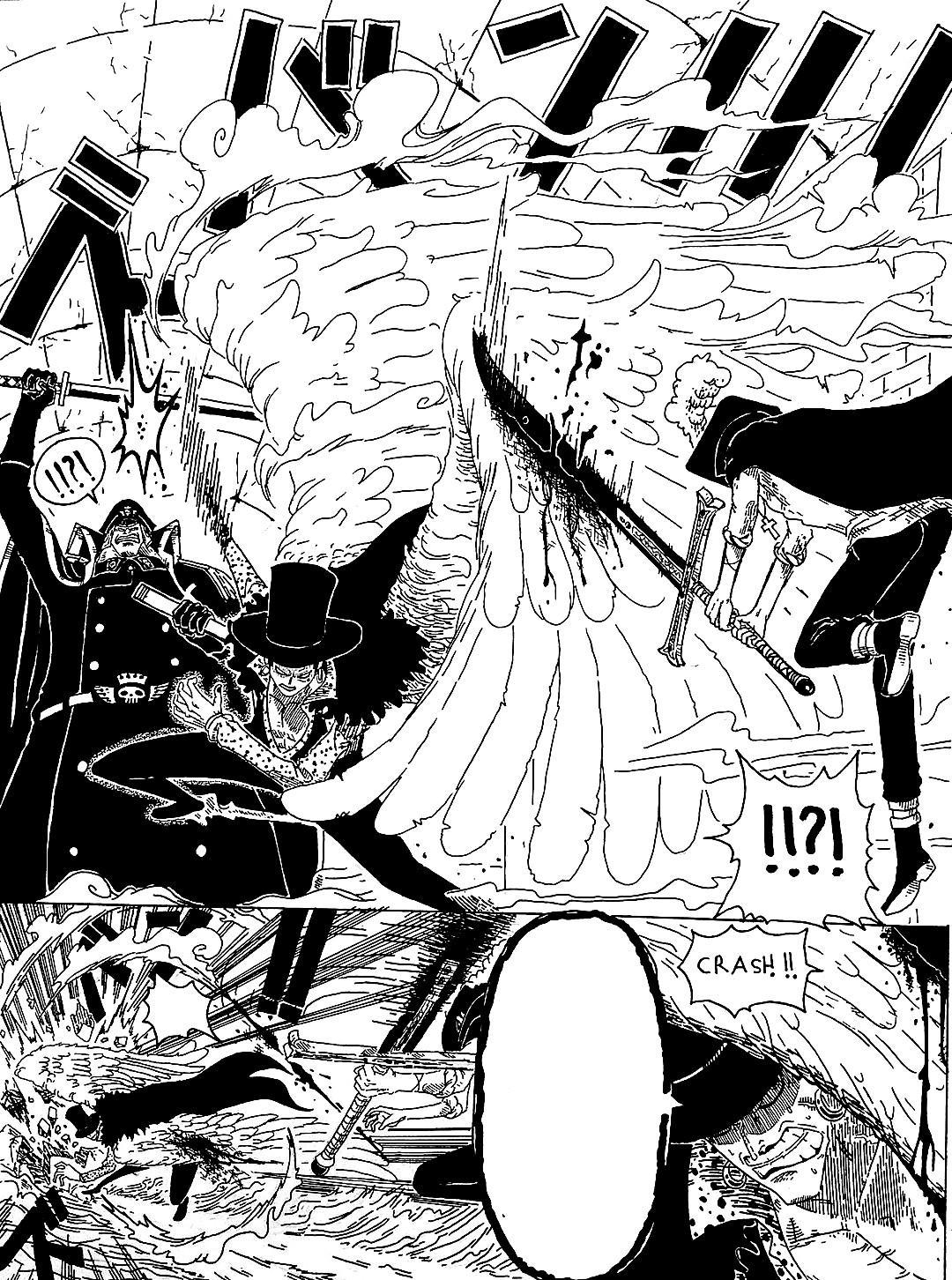 此時,鷹眼現身,與黑鬍子商討合作的可能性,因爲十字公會正與海軍形成對峙之勢。然而,希留的衝動行徑,在無視鷹眼實力的情況下挑起戰端,結果卻是自取其辱。