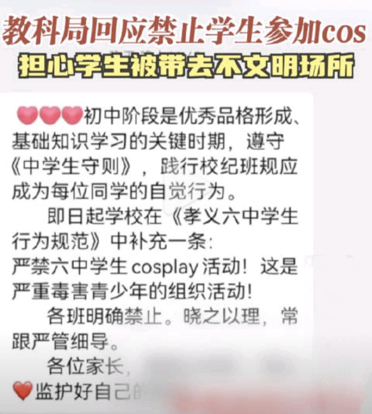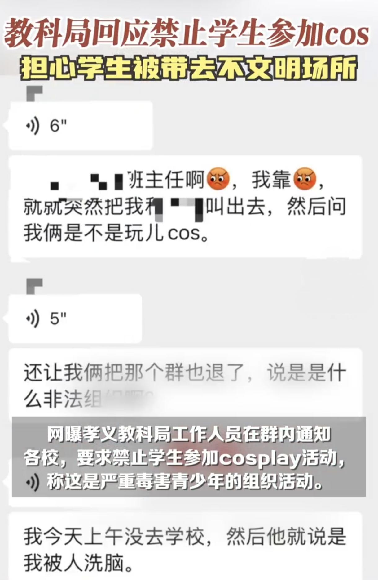 有相關傳聞,在當地教科局下發命令後,有學生已經被老師約談,要求其退出有關cos或漫展的羣,甚至說這類羣是非法組織。
