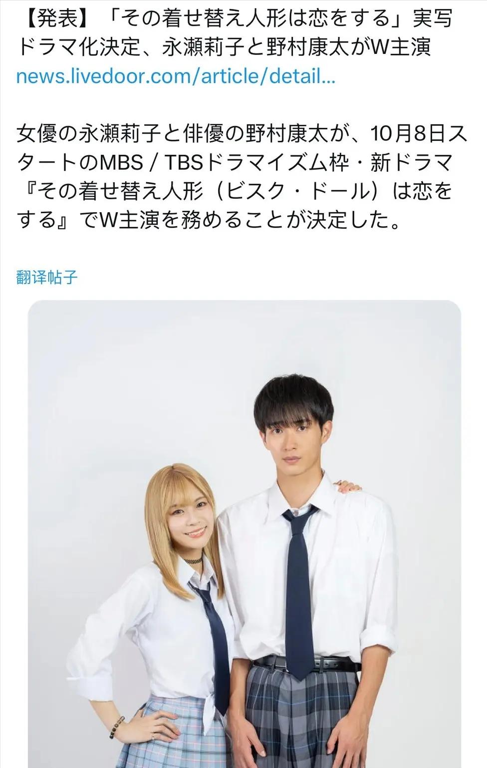 《更衣人偶墜入愛河》真人版是正式上線於2024年10月8日,目前已經更新到第二話的內容,由永瀨莉子、野村康太主演,反正咱也不認識。