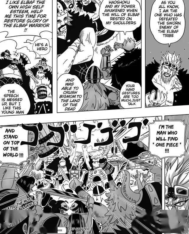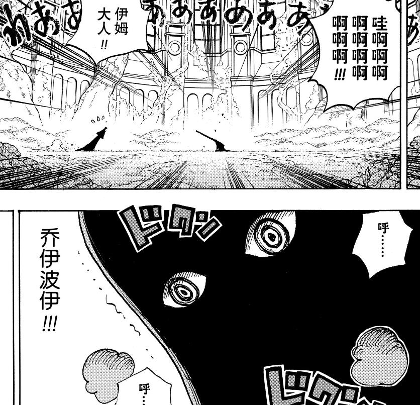 被喬伊波伊的霸氣嚇得跪倒在地的伊姆,怎麼都想不到喬伊波伊已經死了這麼多年,居然還有留有霸氣在這世上,而且還偏偏是200年前襲擊瑪麗喬亞的巨大機器人,甚至這玩意還藏在蛋頭島,簡直是命運弄人。