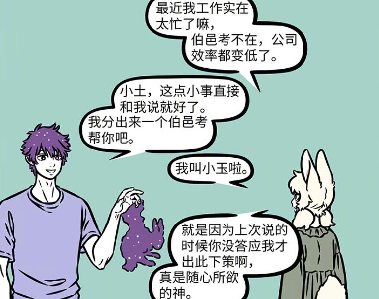 原來玉總最近工作實在是太忙了,之前自己有三個伯邑考,幫助自己打理公司,自己也是過得很清閒,如今伯邑考不在,公司的效率都變低了,所以玉總想要拿走一個伯邑考。聽到玉總這麼說,紫薇大帝直呼給自己說一聲就行了,然後大手一揮,就從抽離了部分身體,分出來一個伯邑考來幫助玉總。雖然紫薇大帝這麼痛快,但還是被玉總吐槽了,只因爲自己上一次就說過了,只是紫薇大帝沒當一回事,這纔出此下策前來偷盜。
