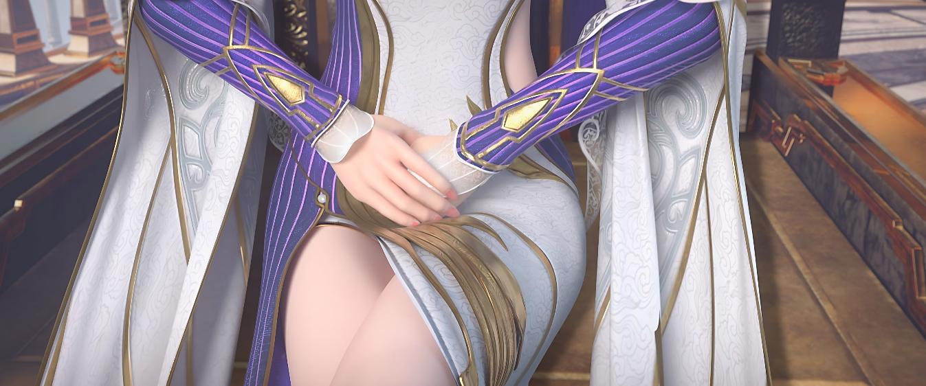 從動畫中能夠看到玄衣的全身建模造型,只見玄衣穿着白色與藍色相間的吊帶抹胸開叉長裙,基本上是採用對稱式的色調。脖領處是半藍半白,而順着長裙下來,裙子前面主要是白色,背後是藍色,而且還搭配了金色線條紋路,使長裙樣式更加的豔麗好看,不失高貴的氣息,還透露着低奢的感覺。