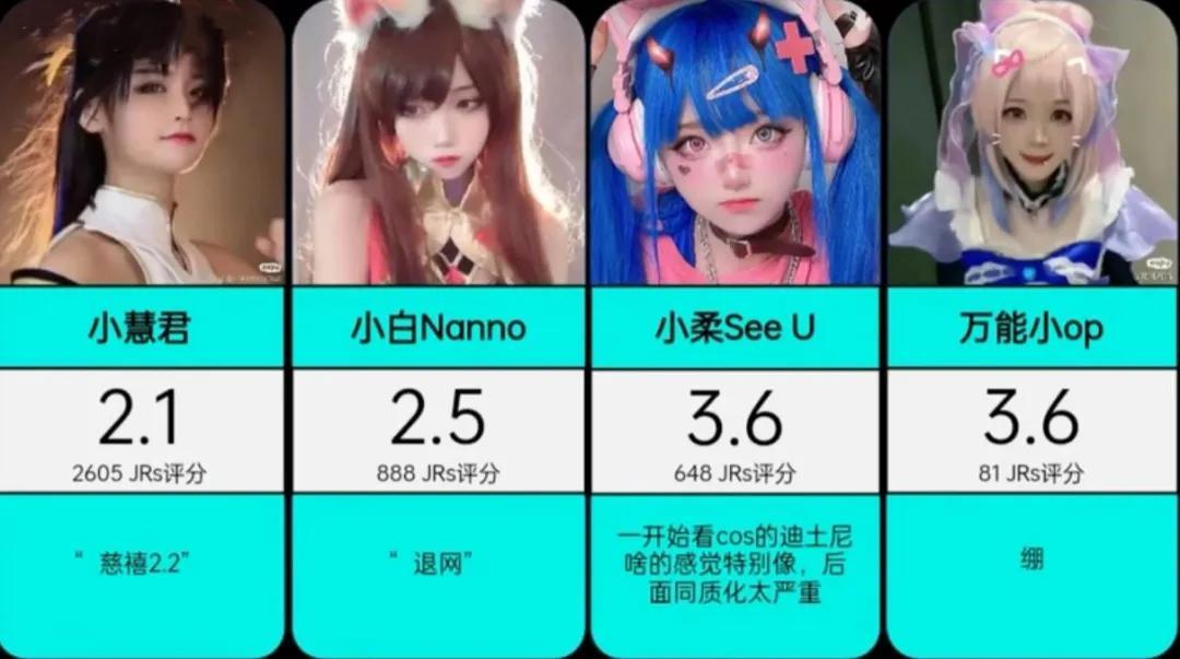 細品會發現她們的顏值也不算低,其中最低的乃是小慧君,曾經也是輝煌過的COSER,可惜卻因造謠被人民網公開批評,爲解約竟陷害老闆太心機了。