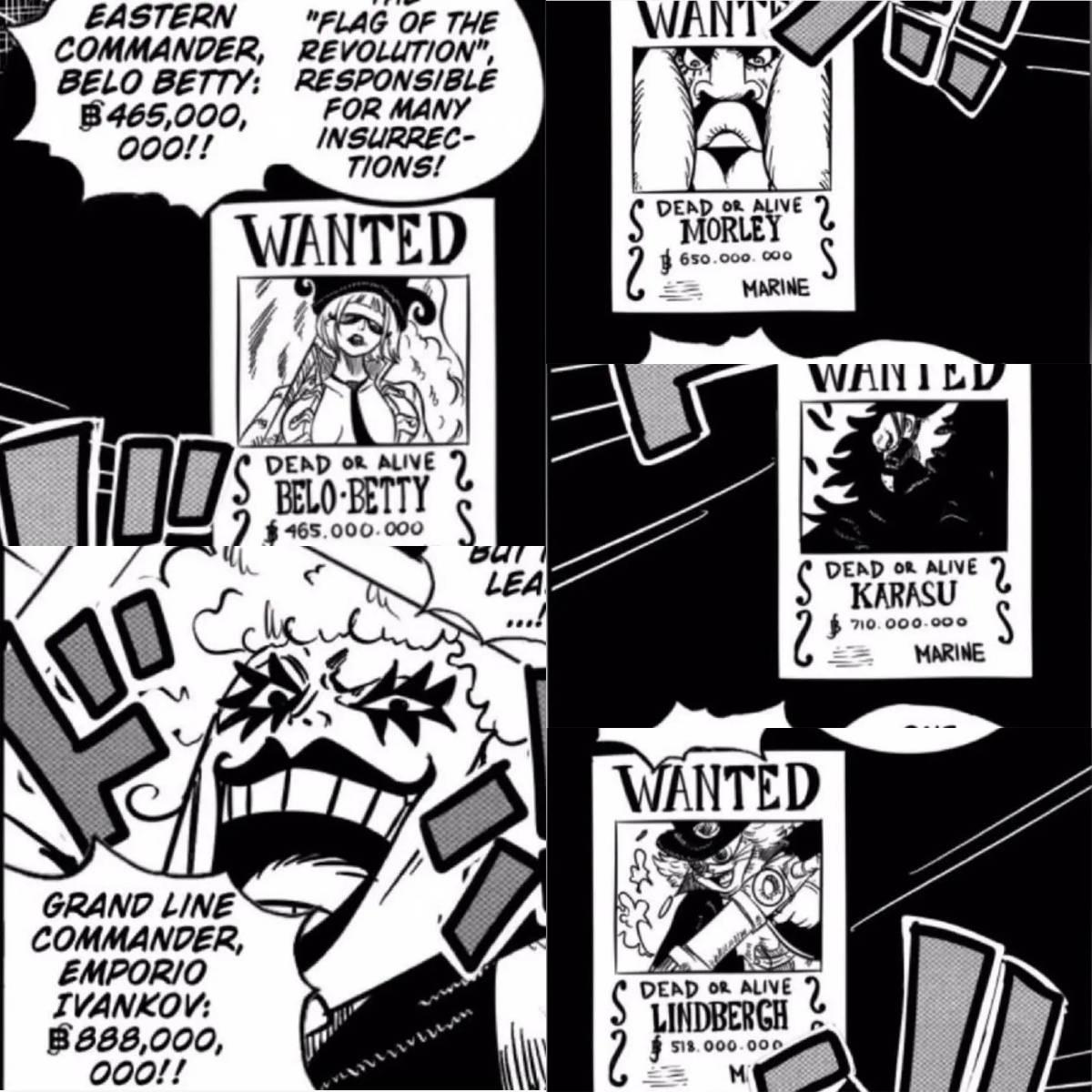最新的懸賞信息已經曝光:貝蒂爲4億6500萬貝里,茉莉爲6億5000萬貝里,烏鴉爲7億1000萬貝里,林德伯格爲5億1800萬貝里,而人妖王伊娃則爲8億8800萬貝里。