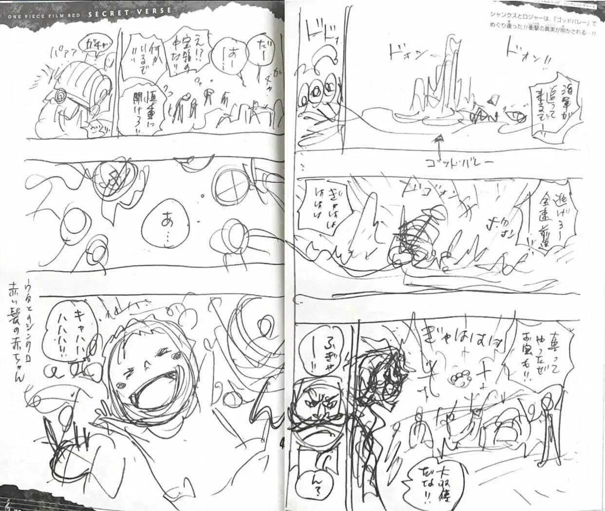 官方發佈的尾田漫畫初稿中,詳細展示了羅傑撿到嬰兒香克斯的一幕,儘管只是初稿,但畫面細節豐富,清晰地展示了羅傑船上新增的小小成員。