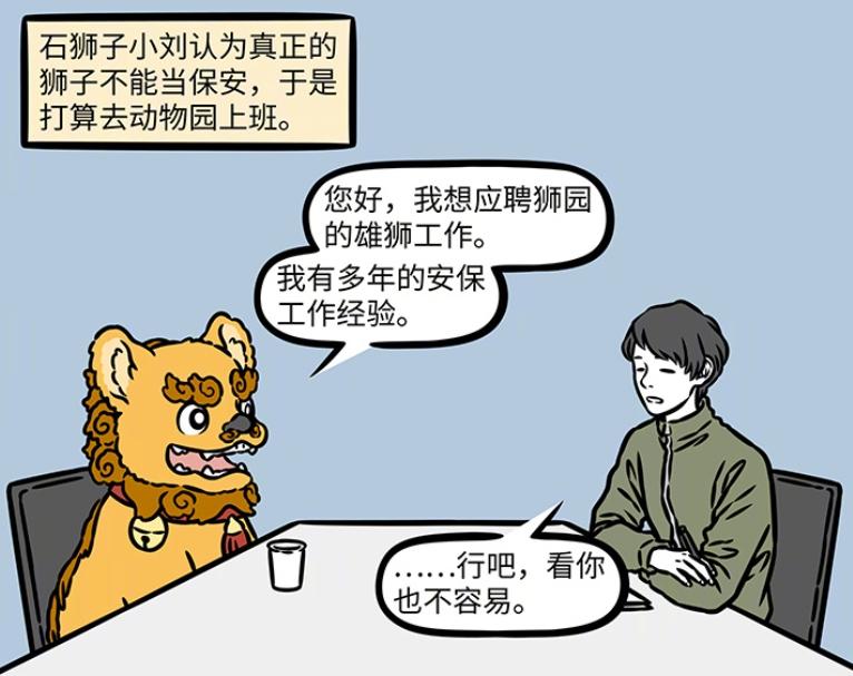 就這樣石獅子小劉以爲變成了真正的獅子,便認爲自己不能再去當保安了,於是打算換新工作。只見他來到了動物園,找到了管理員,說出了自己想要應聘獅院的雄獅工作,還專門提到了自己有多年的安保工作。管理員看石獅子小劉這麼誠懇,看他也是不容易,縱然他與真獅子長得不一樣,但還是答應了他的請求。
