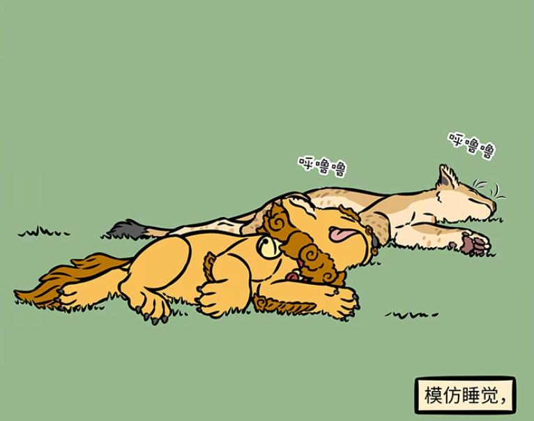 只見石獅子小劉先是跟着一頭母獅子,模仿她的奔跑方式,隨後一頭公獅子同事窩在草地上休息撓癢癢的時候,石獅子小劉便來到他的旁邊,也學着他的樣子,躺在一旁用右腿來給自己撓癢癢。甚至在獅子同事睡覺的時候,石獅子小劉也會來到一旁,模仿其睡覺的樣子,學着打呼嚕。