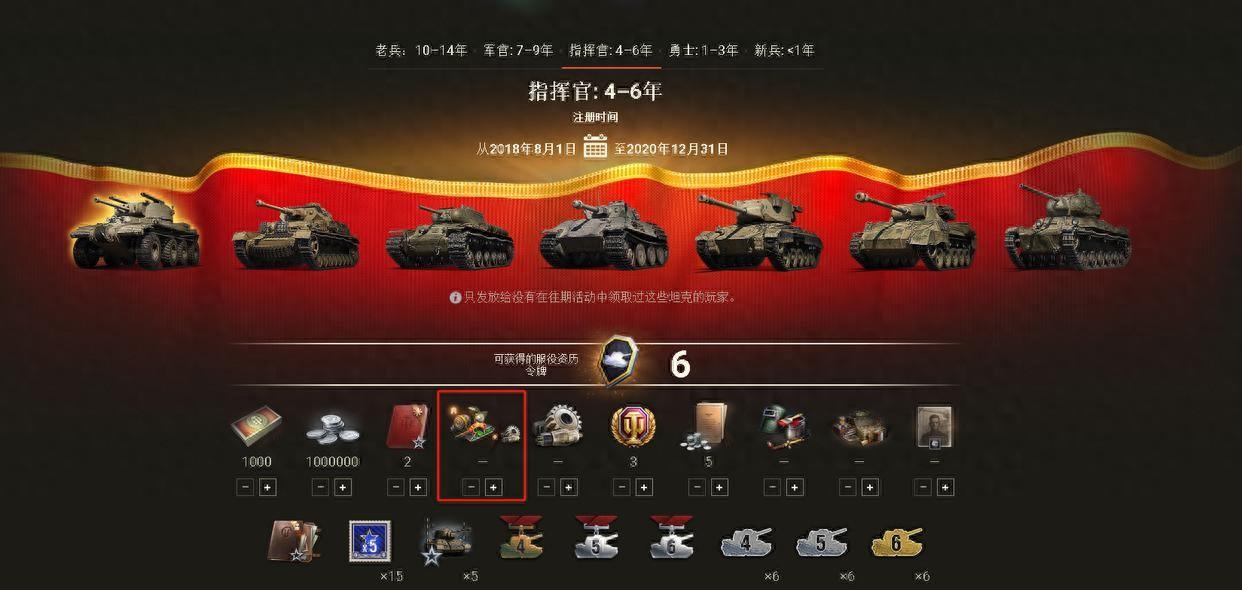 從駕齡4年的“指揮官”(2020年底前註冊賬號)開始,車長們就會獲得的6個資質令牌,花5個令牌就可以自選一個三級橙裝+100合金元件的套餐。