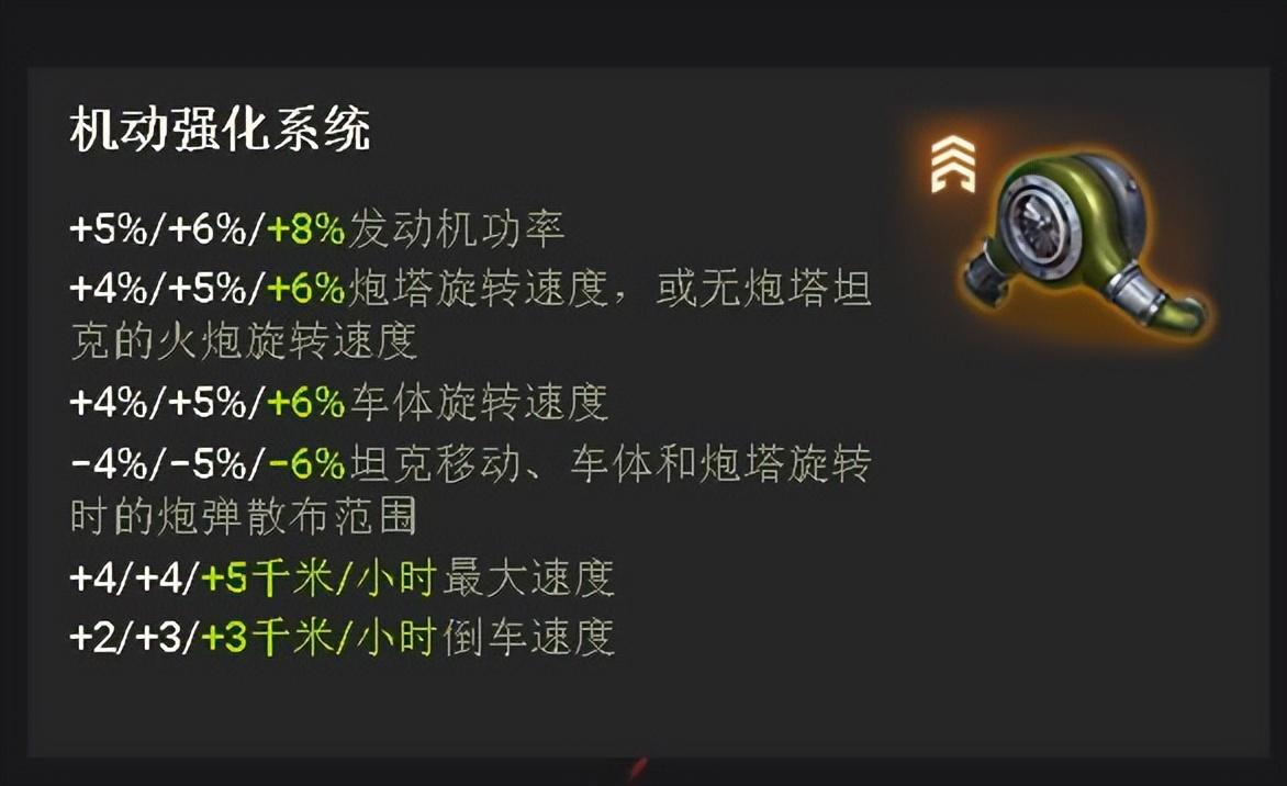 三級橙裝的效果可以簡單的理解爲多個白裝拼到一個槽位然後綜合性能打個折扣。像T95和土龜MK.Ⅰ這種比較笨重,在速度和旋轉性能上都不大行的烏龜TD就可以上橙渦輪,綜合提升機動和火控。