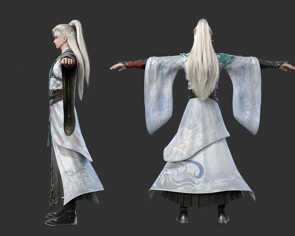 其次就是服裝了,雖然還是長袍,但是沒了中間的布條遮擋,反而是大大方方露出來,這樣打鬥起來也方便多了。最重要的是樣式變得新穎了,裏面採用黑色長袍做內襯,外面則採用了青白色調的長袍,肥大的袖帶,還搭配了金邊,服裝也是勾勒出了不少的雲朵圖案。肩甲換成了青色玉質,搭配着黑色腰帶,也佩戴着一塊紅絛玉佩。整體來看,真的是充滿了新鮮感,完全顛覆了以前的造型,尤其是白髮青白長袍,真的是太帥了,顏值上升了好幾個維度,達到了粉絲們的期許。