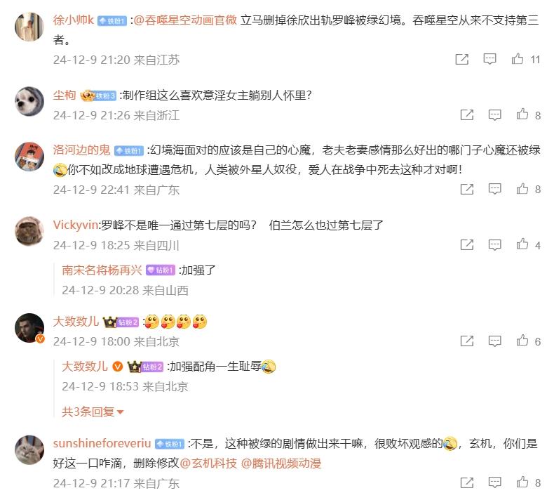 動畫這麼魔改原創,一來是讓徐欣這個角色變得有點招黑了,按理來說,原創戲份是爲了動畫更好看,讓角色更有立體感,而不是抹黑,毀掉她。二來也是羅峯有些自卑,如今羅峯依然是太初空域的核心弟子,堂堂銀河領主,張昊白只是學生時代的一個小插曲,現在他們早已不是一個世界的人,羅峯在幻境中看到張昊白與徐欣走到一起,這完全是抬高了張昊白,貶低了羅峯自己。光是從官微的評論區就能夠看到,很多網友和粉絲都不接受這個原創戲份,覺得動畫的魔改有些噁心人,紛紛表示要把這個橋段給刪減掉。