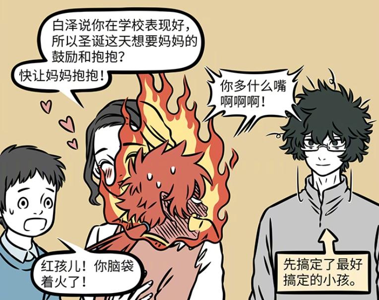 白澤早就告訴鐵扇公主,紅孩兒在學校表現不錯,希望在聖誕這一天能夠得到媽媽的擁抱和鼓勵。而鐵扇公主得知後,直接給了紅孩兒一個大大的擁抱。雖然紅孩兒很滿足,但是當衆被媽媽擁抱,自己還是有些害羞的,畢竟自己活了那麼久,還貪戀母愛,還被朋友當衆拆穿了,紅孩兒整個人都紅暈了,腦袋上都着火了。但不管怎麼說,白澤率先用鐵扇公主搞定了紅孩兒,接下來就是龍女和哪吒了。