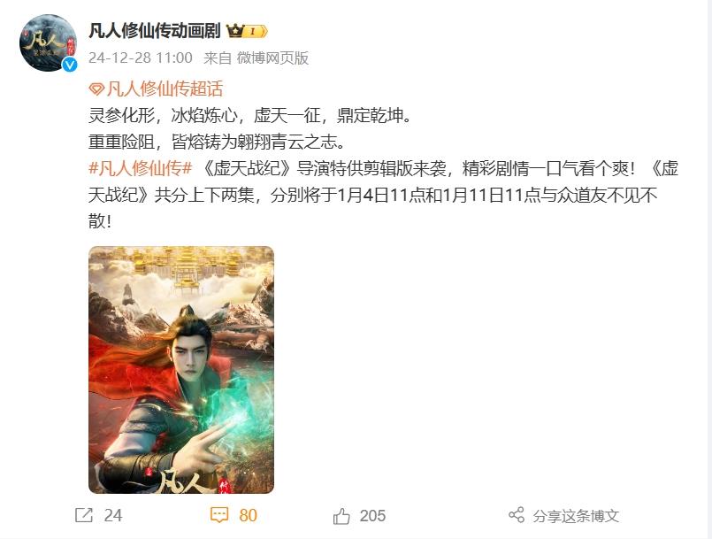 其實在某站的國創發佈會上,凡人修仙傳動畫的王導就提到了這個企劃,並且直呼要在新年番開播之前播出。事實證明,王導沒有食言,如今在凡人修仙傳動畫官微正式發佈了定檔動態,當場官宣導演特供剪輯版的《虛天戰紀》特別篇,將在1月4日和1月11日上映播出。
