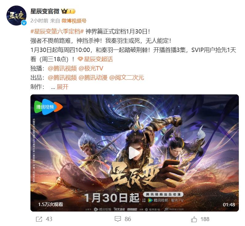 根據星辰變動畫官微發佈的定檔動態來看,第六季神界篇將在1月30日正式上映播出。由於神界篇幅比較多,至少是半年番節奏,所以第六季首播就是三集,接近一個小時的時長,真的是爽翻了,讓人一次看個爽。而且星辰變動畫選在了週四檔,1月30日也是大年初二,這下過年也太給力了。
