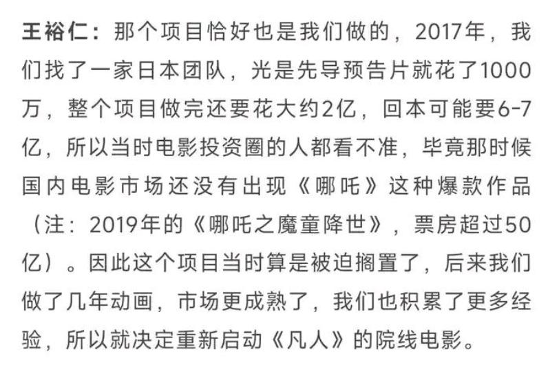 前不久還搞了虛天戰紀導演剪輯版,而且還推出了番外篇玄骨傳,甚至還趁機合作了一把3A級別的凡人修仙傳遊戲,完全是朝着黑神話悟空級別前行的。只是在採訪中,王導又提到了一個全新的企劃,那就是凡人修仙傳動畫跳過了特別篇和劇場版,直接準備推出院線大電影,這可是所有國漫作品的終極目標呀,簡直是意外之喜。