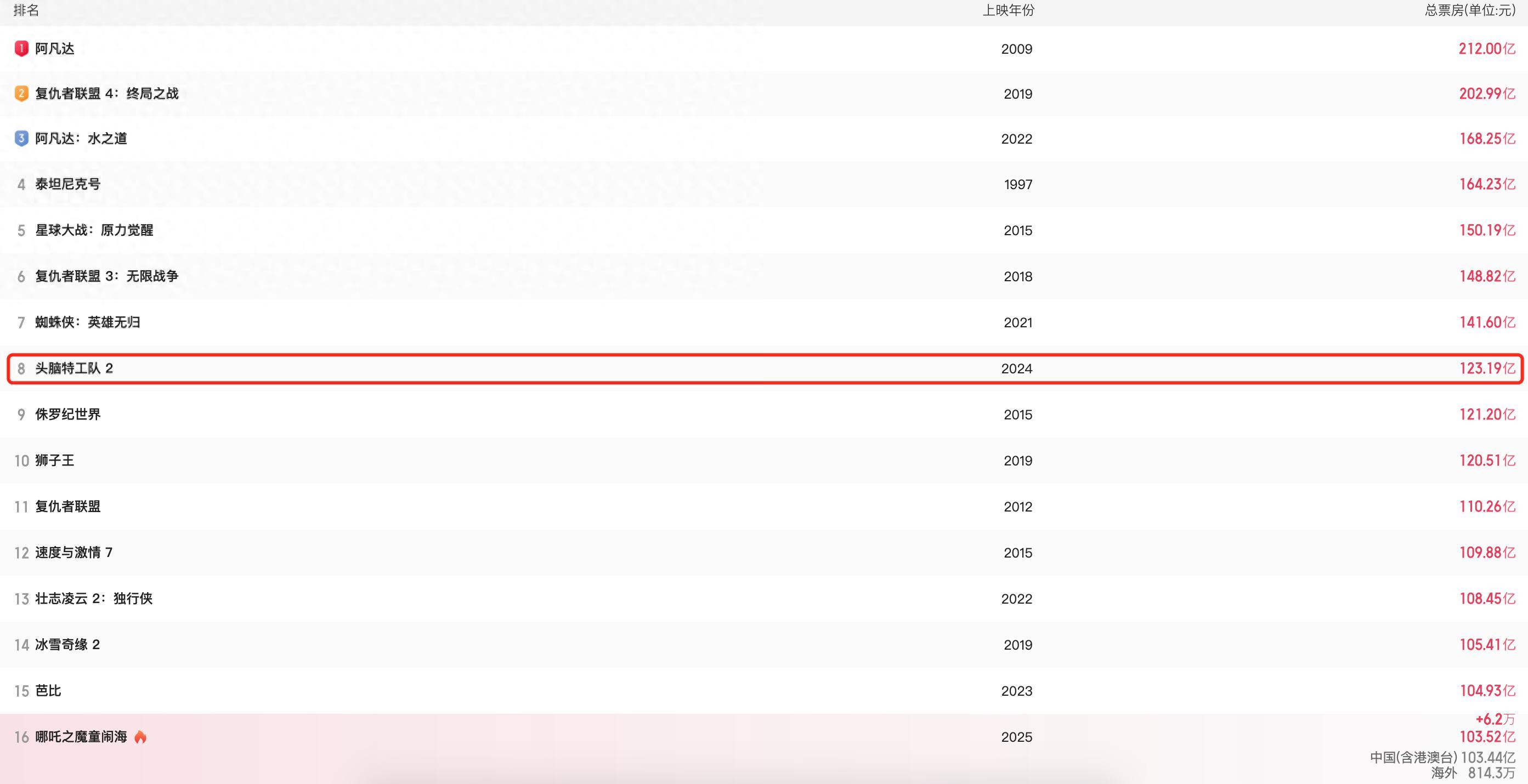 據悉,該片票房(含預售)已突破103億,超越《超級馬力歐兄弟大電影》,穩居全球動畫電影票房榜前三位。更令人矚目的是,票房仍在迅猛增長,預計總票房將達到160.3億人民幣,有望衝擊全球電影票房榜前五的佳績。