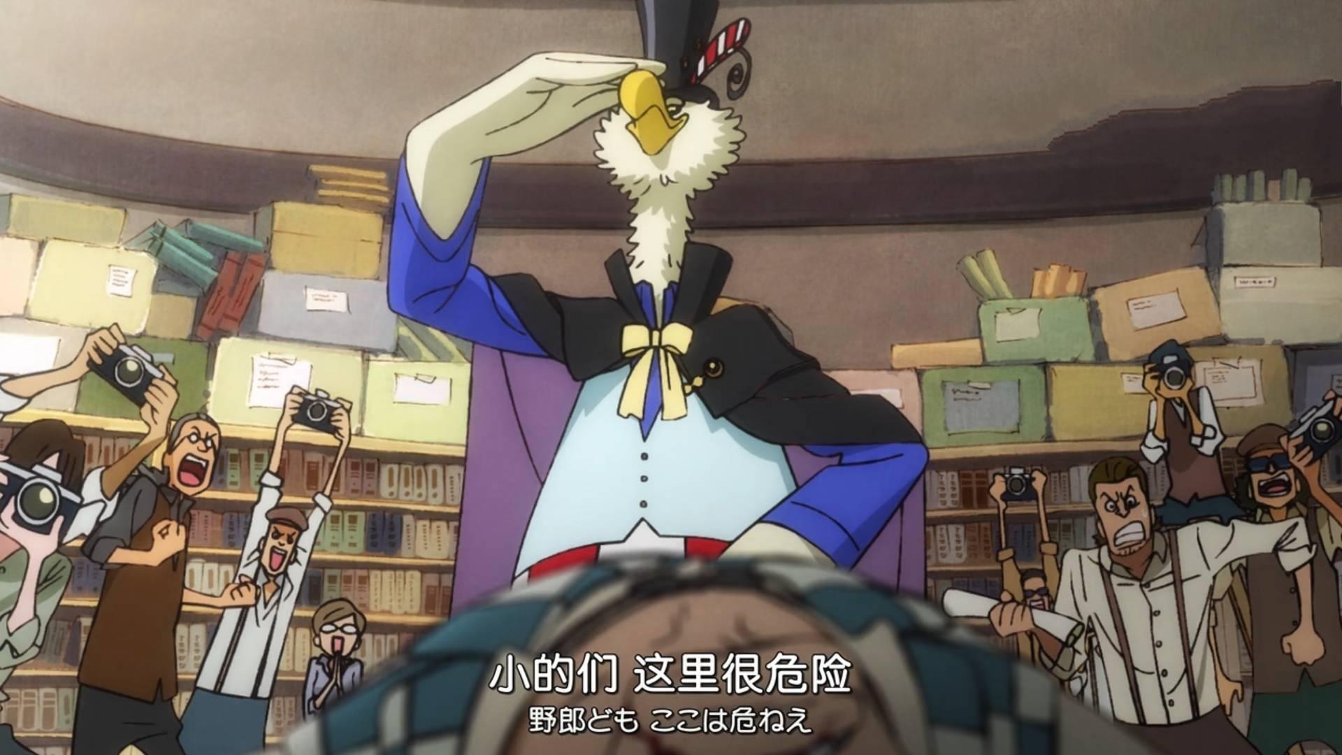 劇情中三人正聚在一起,摩根斯在思考報道路飛大鬧蛋頭島事件的頭版標題。