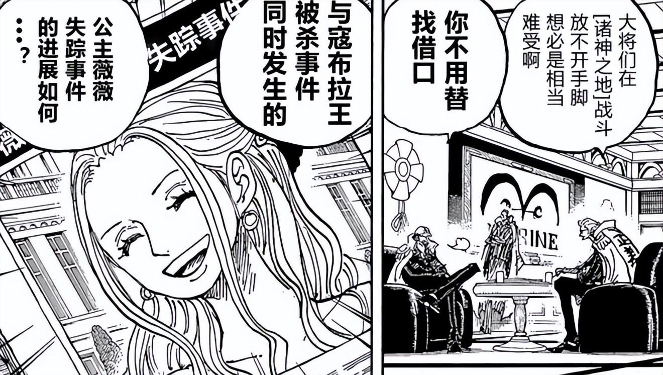 也因此海米們對於目前所處的最終章主線會如何推進的主流猜測都是路飛爲了救出薇薇,與伊姆展開決戰,但是在剛剛更新的1074話中,薇薇再次出現,並沒有被伊姆抓住,而是與瓦波爾一起躲在了摩根斯的新聞的船艦上。