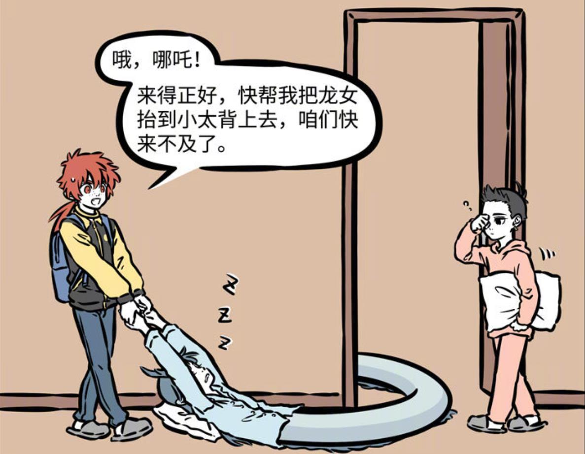 但很可惜,哪吒並不是爲了把龍女抬到賽太歲身上,而是直接把龍女的尾巴當成了棉被,直接躺在枕頭上睡覺,估計哪吒也是真的困了,幾乎是瞬間便又進入夢鄉