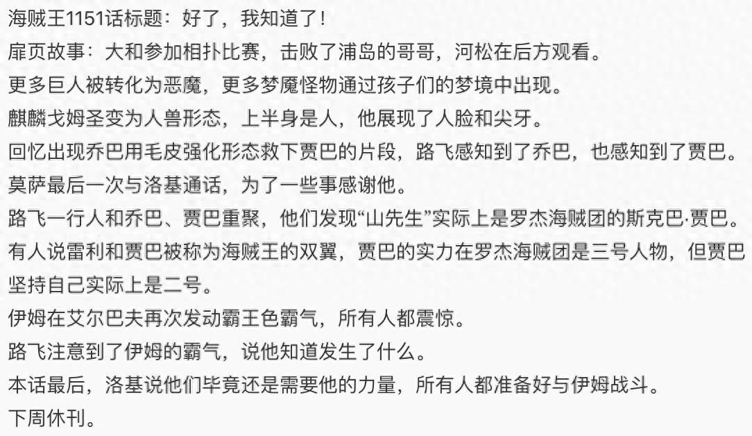 目前海賊王漫畫第1151話文字情報已經更新,不過情報師還在憋大招,或許要等到明天凌晨纔有第二波情報!但從他現在所呈現出來的信息同樣十分炸裂,讓我們最期待的三人組和新巨兵海賊團、洛基、賈巴等人終於要加入戰鬥了!而最終BOSS伊姆也將在巨人島與現如今的太陽神尼卡能力者路飛(喬伊波伊轉世者)決鬥,看看神魔大戰到底誰更一籌呢?