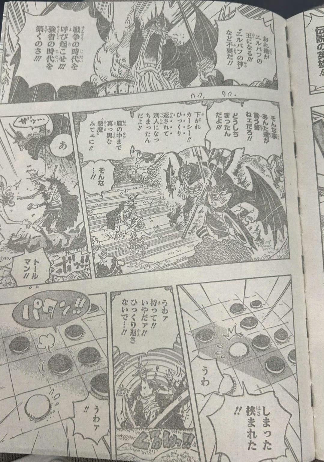 分鏡裏呈現出來一個巨人也被惡魔化,尾田還很貼心的展示【黑白棋】,怕一些動漫迷不懂!所以接下來的大戰就是【下黑白棋】咯!哈哈!白色代表路飛的太陽神尼卡,黑則是伊姆的惡魔。