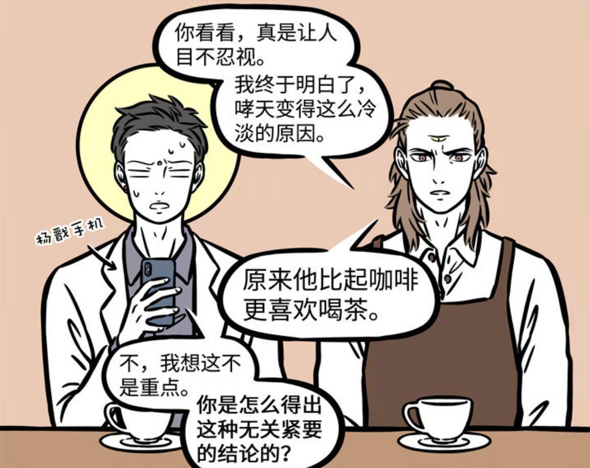 一旁的大士則是一臉無語表示這應該不是重點,相比起咖啡和茶,和哮天一起喝茶的黑衣男子才更值得關注吧,與此同時大士也好奇,楊戩是怎麼從接連幾天的跟蹤和觀察中,得出如此無關緊要的結論