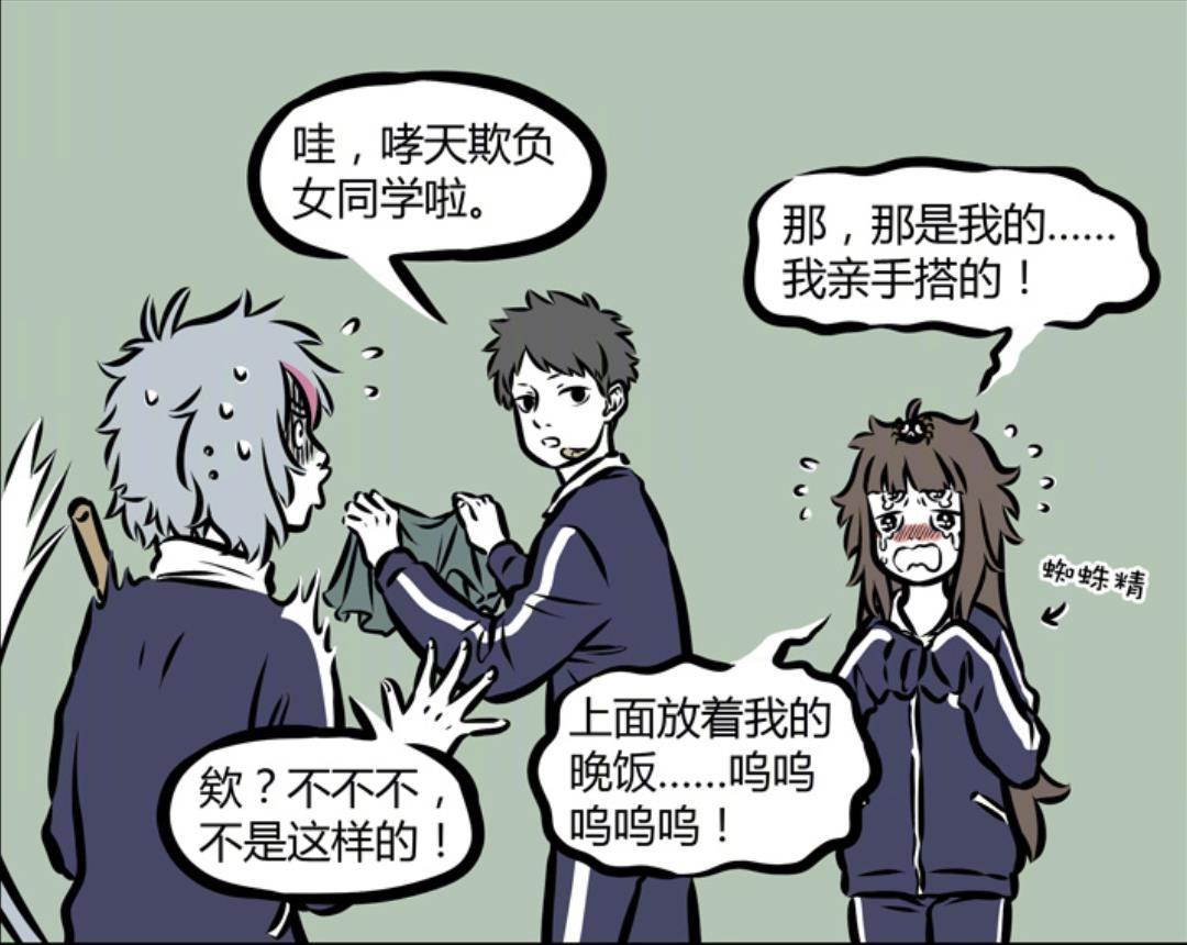 原來這位哭泣的小女生,竟然是蜘蛛精,而被哮天當成是垃圾的蜘蛛網,噎死小蜘蛛在教室的臨時住所