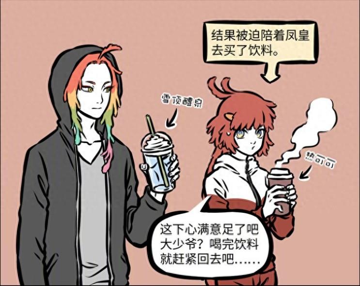 眼見飲料都買完了,朱雀一臉心不甘情不願地表示,這下鳳凰應該滿足了吧,喝完飲料就趕緊回去吧