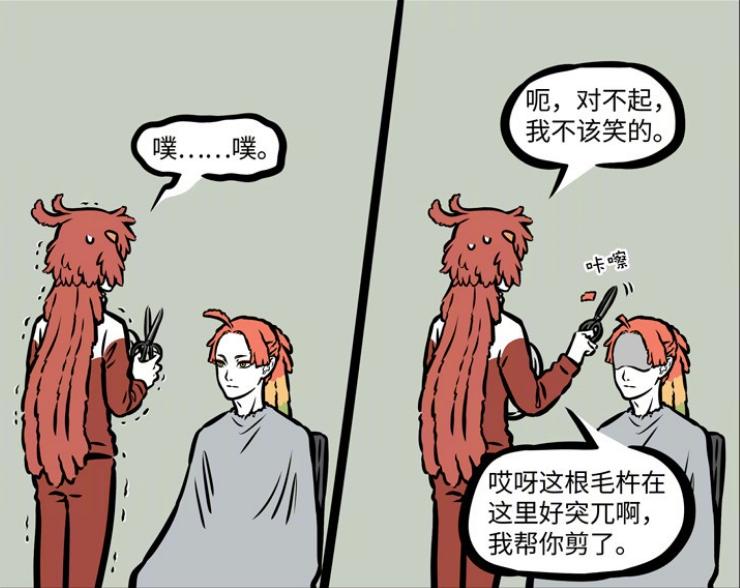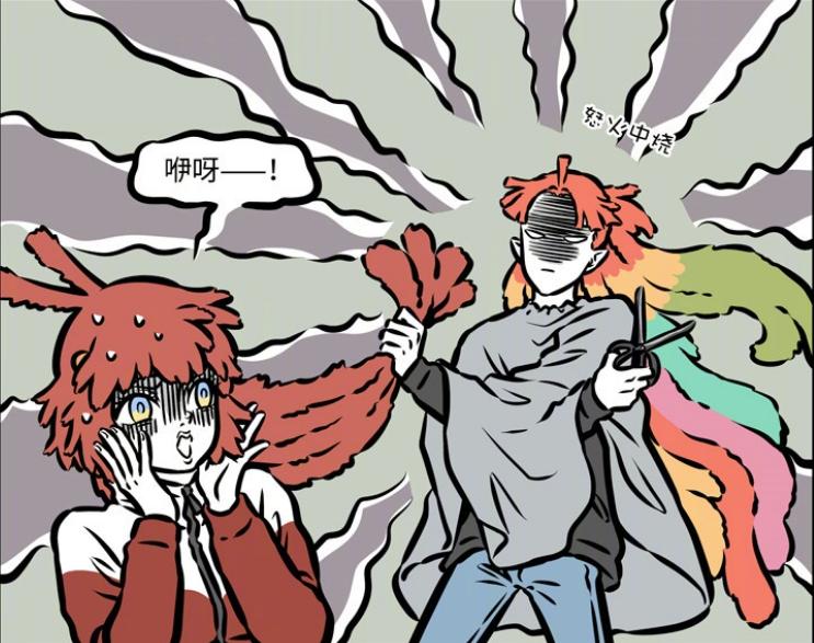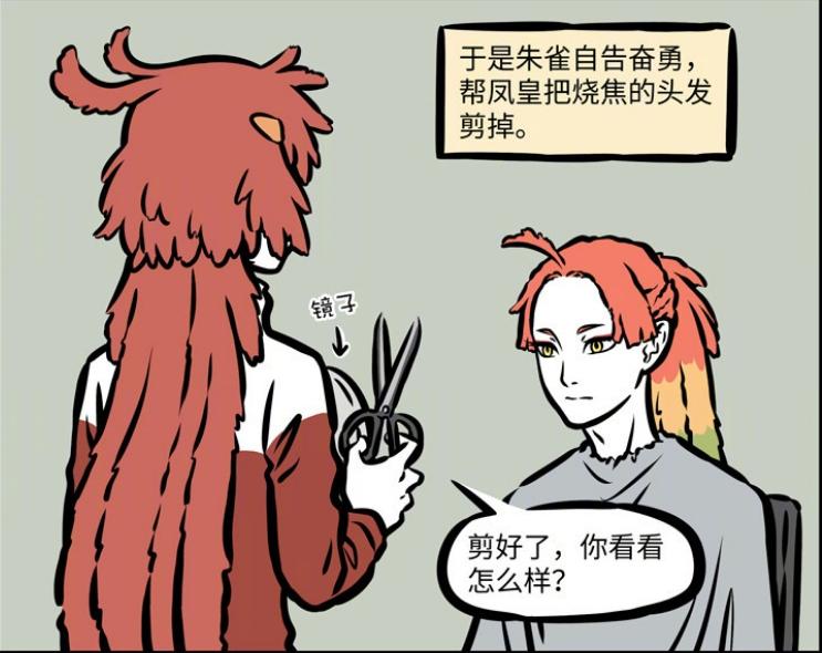 或許是爲了轉移話題,朱雀表示鳳凰頭頂上的羽毛十分突兀,自己幫他剪掉吧,還沒等鳳凰開口,朱雀就直接把鳳凰頭頂上的羽毛一刀切,讓原本就有點呆的髮型顯得更傻了