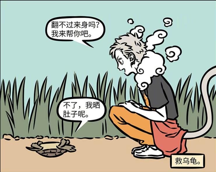 孫悟空熱情詢問烏龜是否需要幫助,結果依舊出乎預料,烏龜表示自己正在曬肚子,並不需要孫悟空幫自己翻身