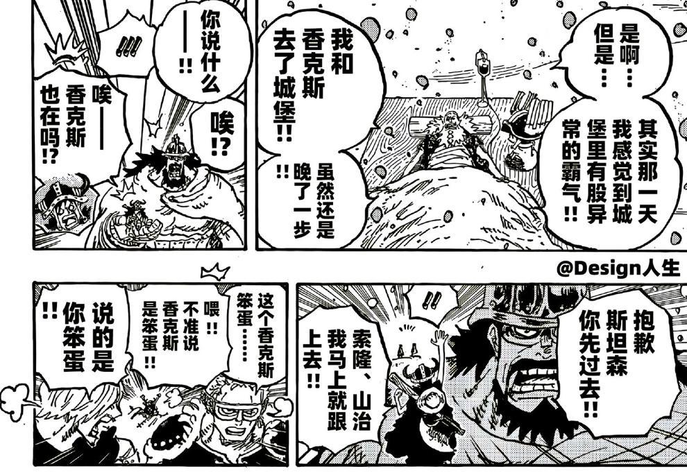 索隆和山治跟隨新巨兵海賊團等人上去,這意味着索隆一定會大顯神威的!而山治的霸王色霸氣還在鋪墊,短時間內還不能覺醒,必須等到山治看到娜美被捆綁,羅賓被索瑪茲的荊棘果實鎖住後,這股力量纔會慢慢甦醒。